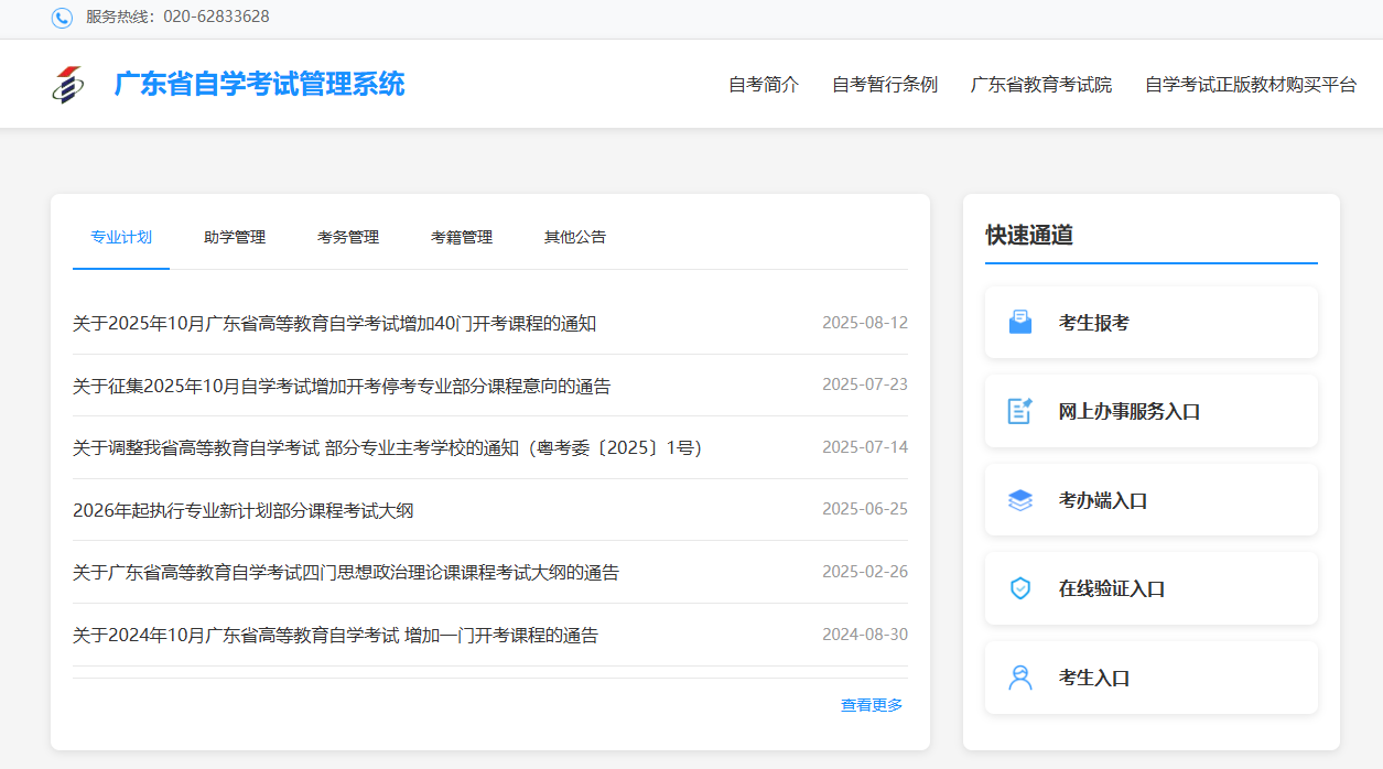 说明:惠州自考报名统一通过广东省自学考试管理系统进行,新生需在规定时间内登录系统,点击“考生入口”进行预报名,并按流程完成正式报名及后续报考缴费等操作。所有业务(报名、报考、缴费、准考证打印、成绩查询等)均在此官网办理,切勿轻信非官方渠道,以免造成信息泄露或影响报名。
