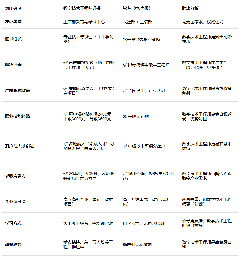 一、数字技术工程师 vs 软考对比表(2025年广东版)